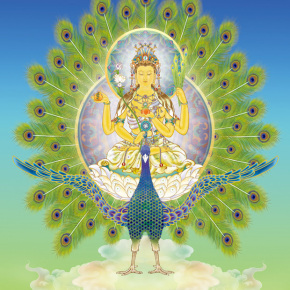 孔雀以啖食一切毒虫来维持性命,代表孔雀明王断尽一切烦恼恶毒,尾则能拂去无量灾祸,招致诸吉祥。