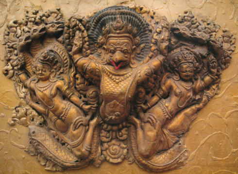 迦楼罗之形象有多种,印度山琦遗迹中之迦楼罗仅为单纯之鸟形,然传于后世之形象则大多为头冀爪嘴如鹫,身体及四肢如人类,面白翼赤,身体金色。由于其以龙为食物,所以在许多造型中多有持龙之像。