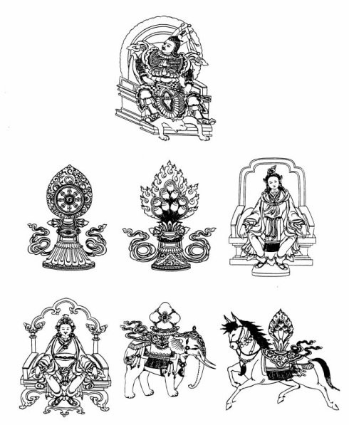 1.轮宝(梵名cakra),为随心飞行的轮宝,象征圣王之威德。
