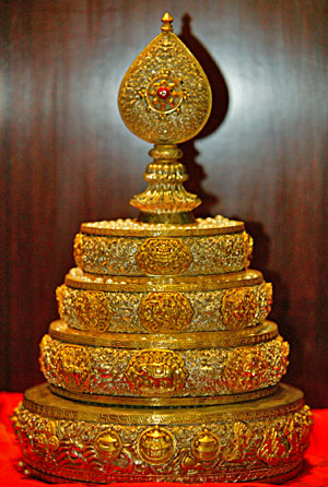 修法时,一面诵念,一面往曼达盘撒匕述的碎石珍宝,撒满底层后再放一层,依次将最后一层放上,象征着祈愿吉祥幸福,将法界供养给诸佛菩萨本尊。