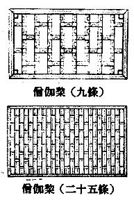 1.僧伽梨:即大衣、重衣、杂碎衣、人聚落衣、高胜衣,为上街托钵或奉召人王宫时所穿之衣,由九至二十五条布片缝制而成,又称九条衣。