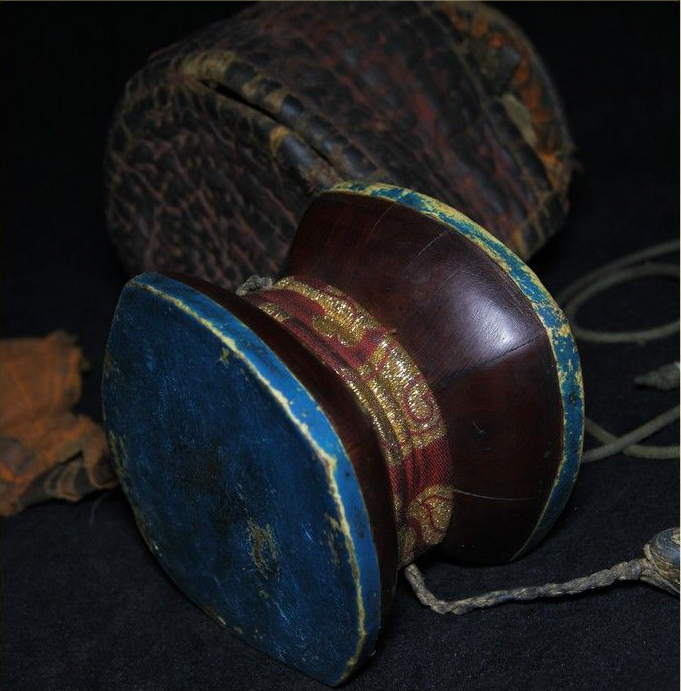修法时摇鼓,代表赞颂诸佛菩萨的功德,配合金刚铃、金刚杵使用。除了手鼓之外,藏密中还有一种特殊的鼓:内中曲柄鼓,它的鼓槌起曲如弓形的,鼓的直径约一米,下有一柄,颂经时,僧人自己左手持鼓柄,右手用曲柄的鼓锤伴奏。