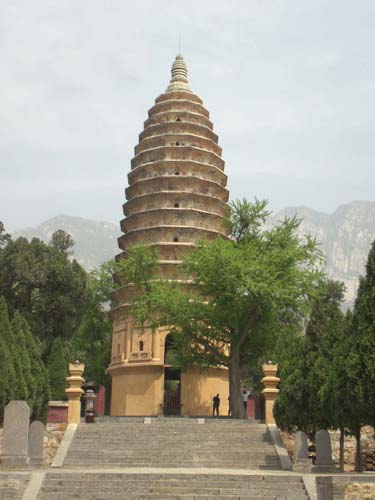 嵩岳寺砖塔:建于北魏孝明帝正光四年愦癸卯(公元五二三年),在今河南省登封县嵩山西麓,十二棱,十五层,为中国现存砖塔中之最古者。