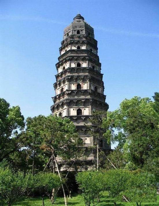 吴县虎丘塔:隋文帝仁寿间(公元六零一至六零四年)建,在今江苏吴县西北阊门外,其基为晋司徒王殉琴台,高七层,今已略见倾斜。