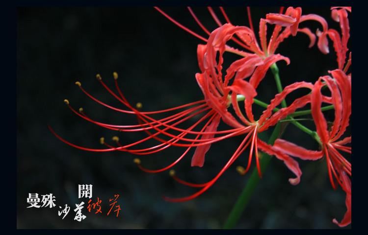 曼殊沙花,意译为柔软、白圆、如意、槛花、赤团花。曼殊沙花于秋天开出深红色的花,叶在花落时才出现于地上,到第二年春天的四月枯萎,所以很容易被遗忘。叶有如细小的水仙,深绿色而有光泽,叶质较柔软。曼殊沙花为四种天华之一,在佛经中常可见其踪影。