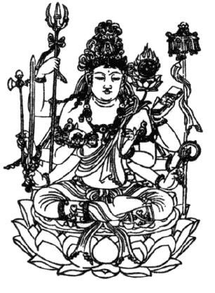 宝手菩萨位列密宗现图胎藏界曼荼罗地藏院九尊中的第六位。其形象乃左手按腰持莲花,花上有三股金刚杵,杵上并有宝珠焰鹭,右手舒掌托宝珠当胸,半跏趺坐于赤莲花上。