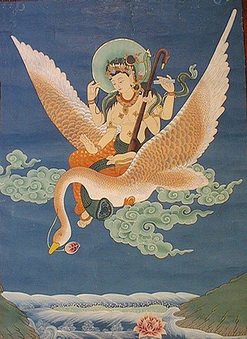 辩才天(梵名Sarasvati、Sarasvati—devi),梵名音译作萨啰萨伐底、萨啰娑嚩底、縒罗莎缚底、苏罗娑缚带等。意译为妙音天、妙音乐天、美音天、大辩才天、大辩才天女,略称辩天,俗称辩财天。此尊在现今印度教所崇奉的造像中,一般多作四臂形,右第一手持花、次手执梵夹,左第一手持大自在天的华鬘,次手持鼓,乘骑雁鸟。
