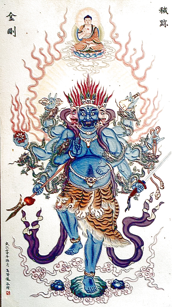 十二,五部净居炎摩罗,色紫白,左手持炎摩幢,右手女竿。五净居即五那含,净居位于上天,炎摩罗,即阎罗王,则处下地。于善极果时,净居天示礼法;于恶极果时,炎摩罗示治法。