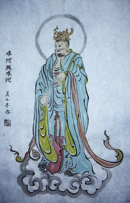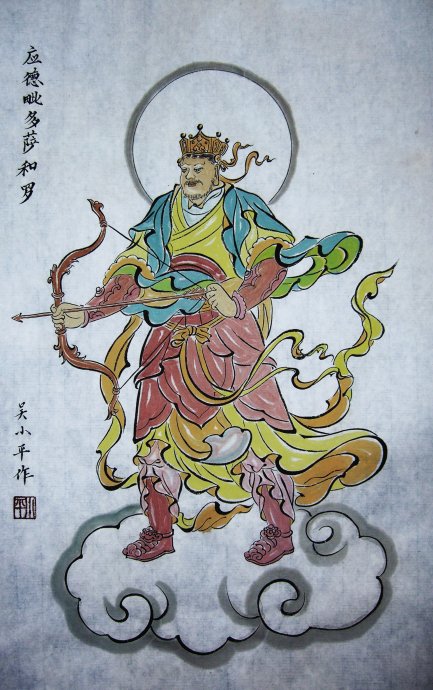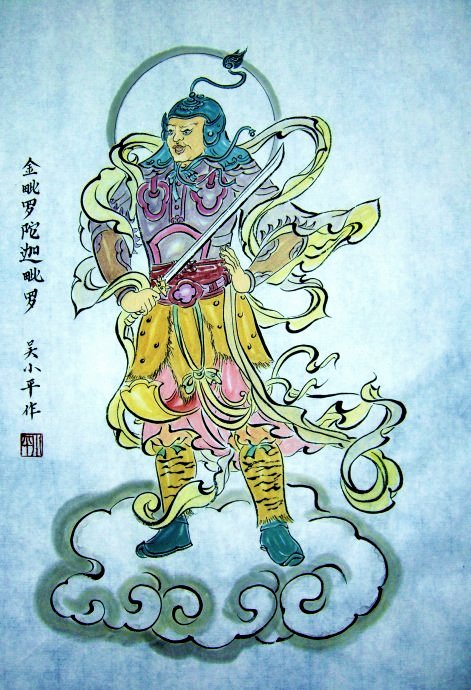 四,金毘罗陀迦毘罗,略称金毗罗陀,或称金毗罗王,也是药师经的十二药叉神将之一金毗罗大将或称宫毗罗大将。白红色,左手把宝弓,右手把宝箭。观音三十二应身中第二十六为药叉应。