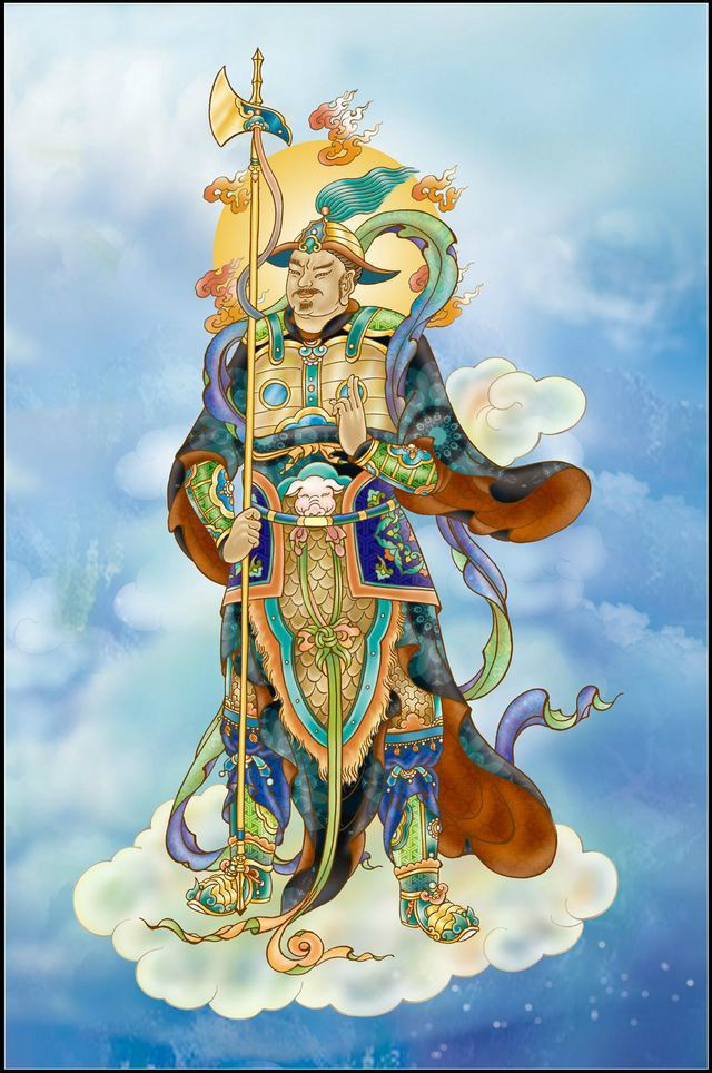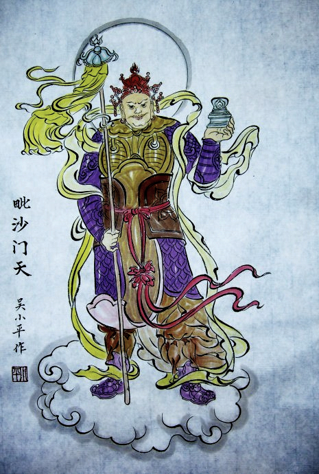 十九,毘沙门天王,又译为毗舍罗门、鞞沙门、毗沙门,即天王殿中四大天王中的多闻天王,俗称托塔天王。色绀青,左手持宝塔,右手杵。住于须弥山第四层之北面,是阎浮提北方的守护神,率领夜叉、罗刹等二神众兼守其余三州。
