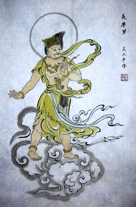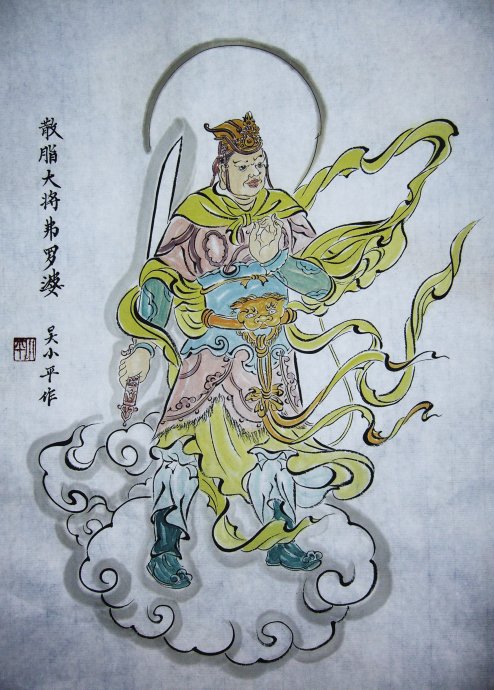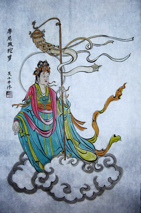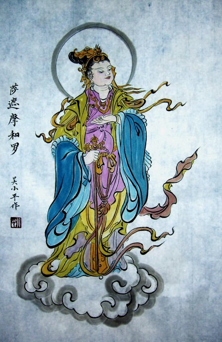 七,萨遮摩和罗,左手把宝幢,上有凤鸟,右手施愿印。《佛说灌顶经》有神王女萨遮摩,大神将军摩和罗。