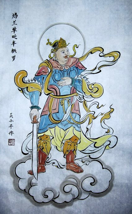 八,鸠兰单咤半祇罗,左手金刚铎,右手金刚拳,白红色。《佛说灌顶经》有神名鸠罗檀提,字战无敌。