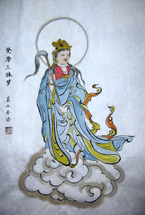 十一,梵摩三钵罗,色红白,左手持宝瓶,右手三股杵。梵摩,即梵,清净之义,指梵天。梵摩三钵,即大梵天。观音三十二应身中第五为梵王应。