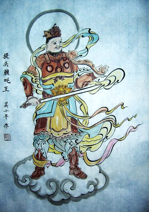 十五,提头赖咤王,又译为持梨哆阿啰哆、提多罗吒,即天王殿中四大天王中的持国天王,又称东方天。赤红色又青白色,左手执如意宝王,右手刀。住于须弥山东面半腹耸出之由乾陀山,率领乾闼婆及毗舍阇,守护东方。观音三十二应身中第十为四天王应。