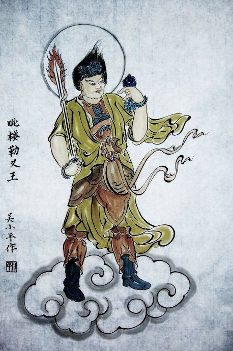 十七,毘楼勒叉王,又译为毗楼勒天、毗楼勒迦天、毗楼勒叉天,即天王殿中四大天王中的增长天王,又称南方天。色赤,左手执杵,右手把剑。住于须弥山之南面半腹之善见城中,常时观察阎浮提之众生,率领鸠槃荼、薜荔多等鬼神,守护南方。