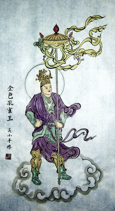 二十,金色孔雀王,身色黄金,左手执宝幢,上有孔雀鸟,细妙色,说无量妙言。