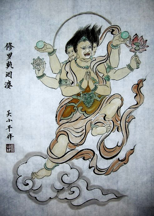 二十五,修罗、乾闼婆、迦楼罗王、紧那罗、摩睺罗伽。修罗,所谓大身修罗也,身赤红色,左手持日轮,右手月轮;乾闼婆,左手执歌琴,右手舞印,身色白红;迦楼罗王,金色两羽具,左手贝,右手执宝螺笛;紧那罗、摩睺罗伽,此两王形白色如罗剎女,有二眼乃至三四五眼,持诸药器等,具足二四六八臂,天冠天衣诸宝珠以为身严。观音三十二应身中第二十八为阿修罗应,第二十七为乾闼婆应,第二十九为紧那罗应,第三十为摩睺罗伽应。参见前文“大悲门”一章“得生人道”一节。