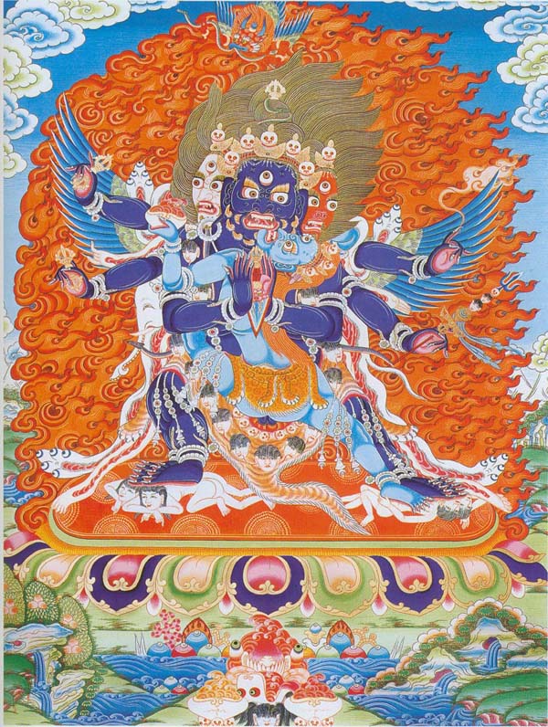 另在《金刚童子成就仪轨》中,有描述此尊自大海中涌出之形象为身如吠琉璃色,六臂三目,其目赤色,口咬下唇,颦眉威怒,头戴宝冠,犬牙上出,左足踏宝山上之莲花,右足没于海中,这也就是一般所说的青童子。