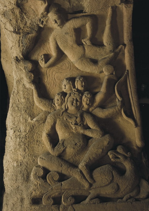 此天手擎鸡、持铃、捉赤幡、骑孔雀。有经称其为大自在天之子,也有将之视为火天之子。