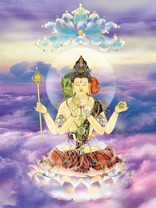 青颈观音的形象,据《不空羂索经》卷九记载,为左手执莲花,右手扬掌,结跏趺坐。《青颈大悲念诵仪轨》记载,其像为三面四臂,所持的物品为杖、莲花、轮、螺四种,身色为红白,颈为青色,代表烦恼即菩提之义。