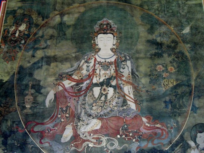 水月观音的图像,在敦煌千佛洞中曾被发现。法国罗浮宫美术馆收藏有其中最古老的一种,相传是唐代中期所作。