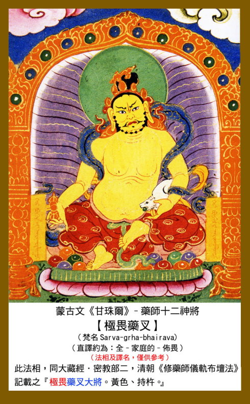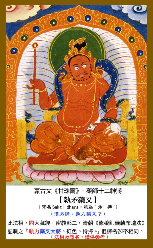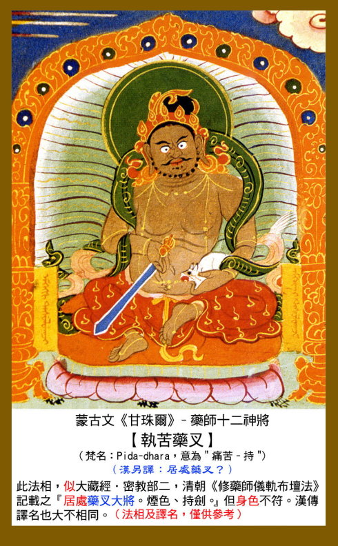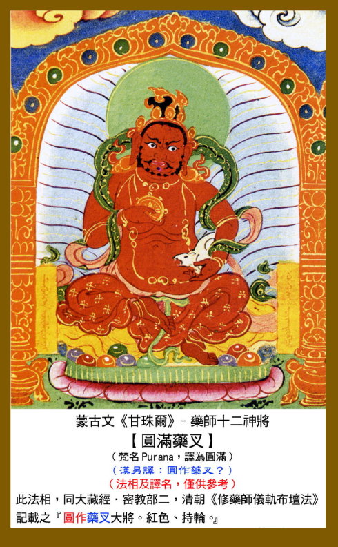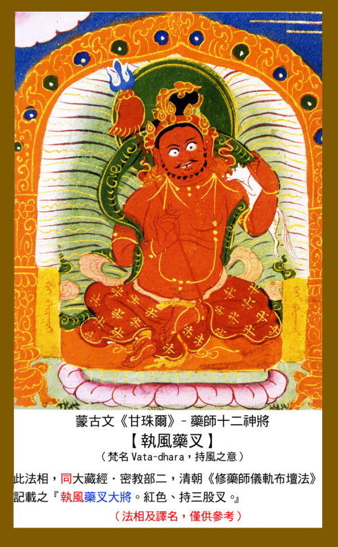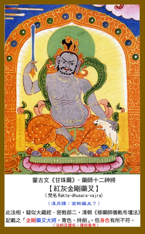 12 毗羯罗,又作毗伽罗,意译为圆作。身呈红色,手持宝轮或三钴,以释迦牟尼佛为本地。