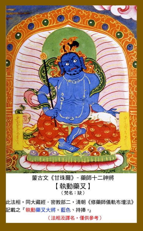 11 招度罗,又作朱杜罗、照头罗,意译为执动。身呈青色,手持宝锤,以金刚手菩萨为本地。