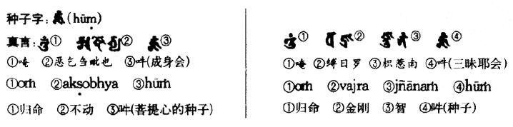 2.三昧耶印:此是阿閦如来在金刚界三昧耶会中之手印。此法为两手金刚缚。二中指伸竖如针状呈独股形。