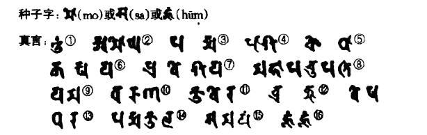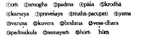 ①唵 ②阿谟伽 ③跛娜摩 ④播舍 ⑤矩噜驮 ⑥羯罗洒野 ⑦钵罗吠舍野 ⑧摩诃跛输跛底 ⑨焰么 ⑩嚩噜拿 (11)矩吠嚩 (12)没嚩憾么 (13)吠洒驮哆 (14)跛那么矩椤 (15)三么琰 (16)吽吽