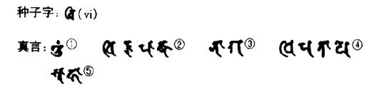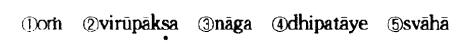 ①唵 ②毗噜博叉 ③那伽 ④地波跢曳 ⑤莎诃(《陀罗尼集经》) ①归命 ②广目 ③龙 ④领主 ⑤成就 手印: 左腕侧向,右腕附着于左腕上,手背相合,两中指、无名指、小指向掌中弯曲,以两拇指指端倾压两中指之指甲,此时两食指相勾结如锁状。