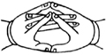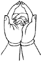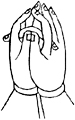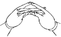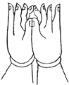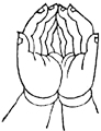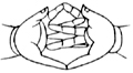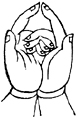 双手虚心合掌,外缚二中指,弯曲二头指成宝形,并排二大指。