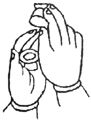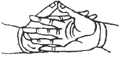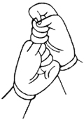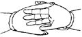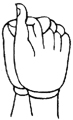 双手内缚,竖立右大指做三度来去(竖立三次)。