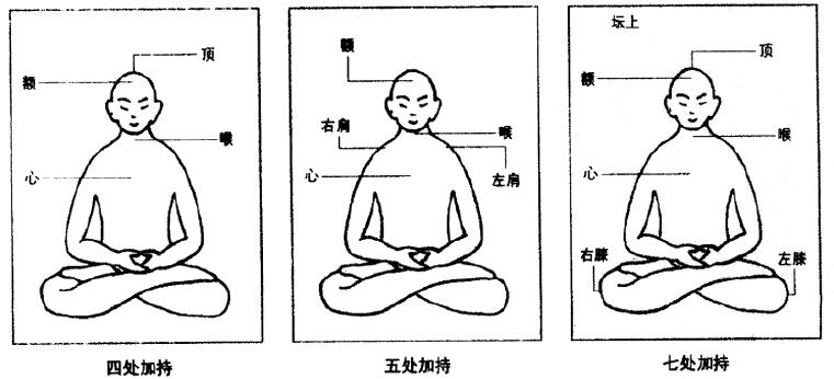 结诵印言时,有指定的所谓四处加持或五处加持,在次第中到处可见要在一定之处做加持的语句,而且指示的位置有很重要的意义。