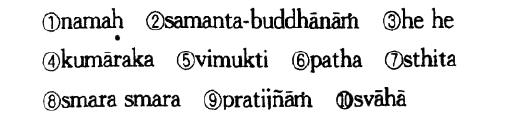 ①南么 ②三曼多勃驮喃 ③系系 ④俱摩罗迦 ⑤微目吃底 ⑥钵他 ⑦悉体多 ⑧娑么罗裟么罗 ⑨钵罗底然 ⑩莎诃