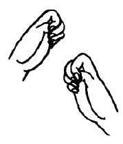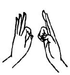 8.六字文殊:于掌中将两无名指以右压左而相勾结,两小指、中指直竖相拄,弯曲两食指而捻各中指之背上节。同时食指来去。