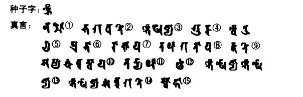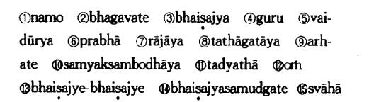①曩谟 ②婆誐缚帝 ③佩杀紫野 ④虞噜 ⑤吠(口+女)哩也 ⑥钵罗婆 ⑦罗惹野 ⑧怛他蘖多野 ⑨罗喝帝 ⑩三藐三没驮野 (11)怛你也多 (12)唵 (13)佩杀尔曳佩杀尔曳 (14)佩杀紫野三摩弩蘖帝 (15)娑缚贺